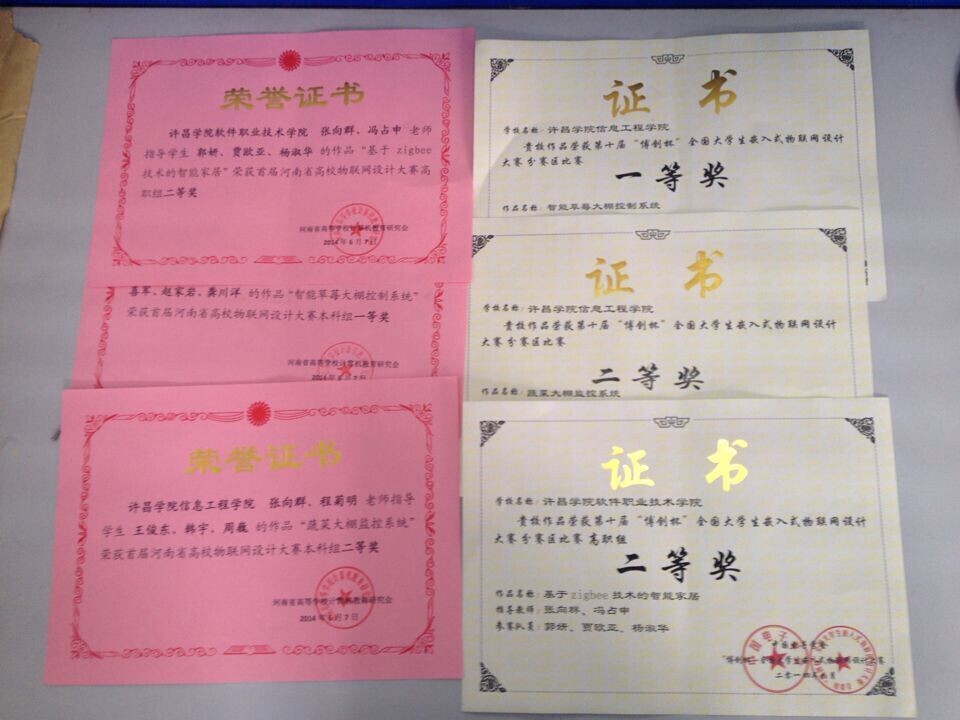 6月6日至7日,第十届“博创杯”全国老员工嵌入式物联网设计大赛(河南赛区)暨首届河南省高校物联网设计大赛在郑州轻工业学院举办。来自省内高校多支队伍参赛,公司共派出3支代表队参加了本次比赛并获佳绩。其中由张向群、王闯老师指导,姚喜军、赵家岩、龚川洋等同学设计的作品“智能草莓大棚控制系统”获得本科组一等奖;由张向群、程菊明、王闯、冯战申等老师指导,王俊东、韩宇、周巍等同学设计的作品“蔬菜大棚监控系统”、郭妍、贾欧亚、杨淑华等同学设计的作品“基于zigbee技术的智能家居”分别获得本科组二等奖、高职组二等奖。