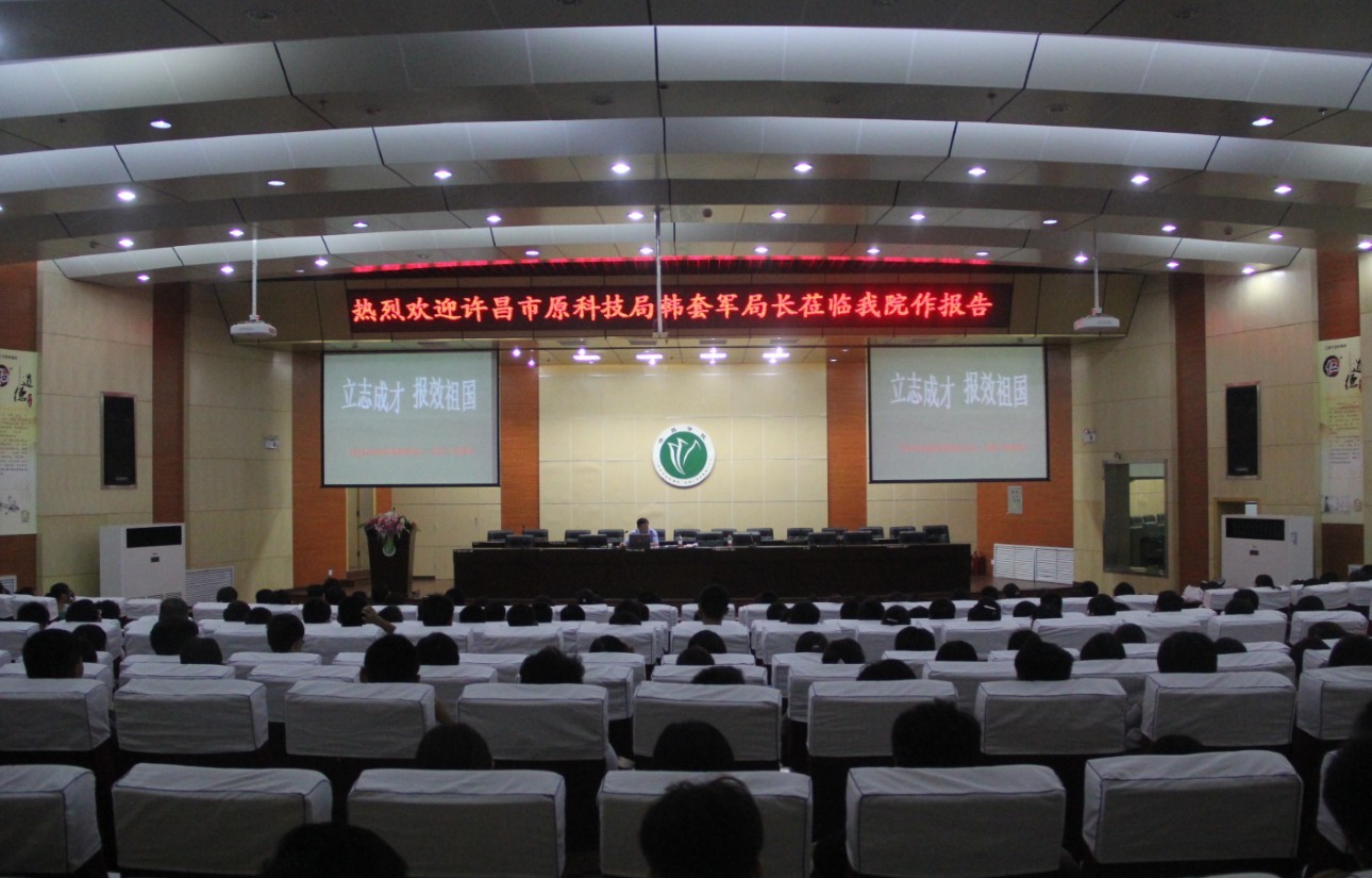 9月12日晚七点,应太阳成集团tyc234cc、软件职业技术学院邀请,许昌市原科技局韩套军局长在学术报告厅作了题为《立志成才 报效祖国》的精彩新生入学教育。太阳成集团tyc234cc、软件职业技术公司党总支书记郭超峰、副书记翟广辉、部分教师及2013级新生近400人参加了报告会。报告会由公司党总支书记郭超峰主持。