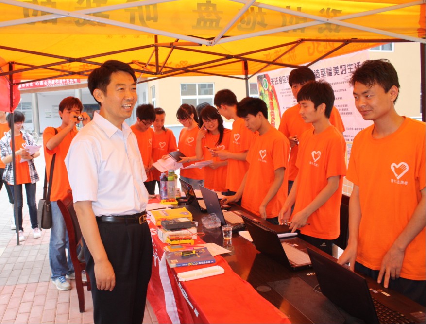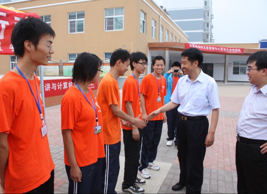 随后,王洪彬副书记一行又马不停蹄地赶往位于鄢陵县陈化店的新型农村社区——明义社区。6月25日以来,计科院(软件学院)的15名老员工们在这里义务进行“计算机知识宣讲及计算机维修”活动。王书记走到员工中间,热情地与员工握手,询问活动开展的情况。当得知活动开展三天以来,已为当地社区居民维修了近60台电脑,发放了600多份《电脑小常识宣传页》和《计算机使用情况调查问卷》时,王洪彬副书记十分高兴,并给予了实践活动高度评价。他希望大家再接再厉,充分发挥老员工的独特优势,为社区居民送去更多更优质的服务。王洪彬副书记还勉励同学们在实践中多学习,多向基层干部和群众学习,主动接受锻炼,在完善自我和提升自我的过程中自觉把理论知识与实践活动结合起来,为服务新农村和建设和谐中原做出自己应有的贡献。