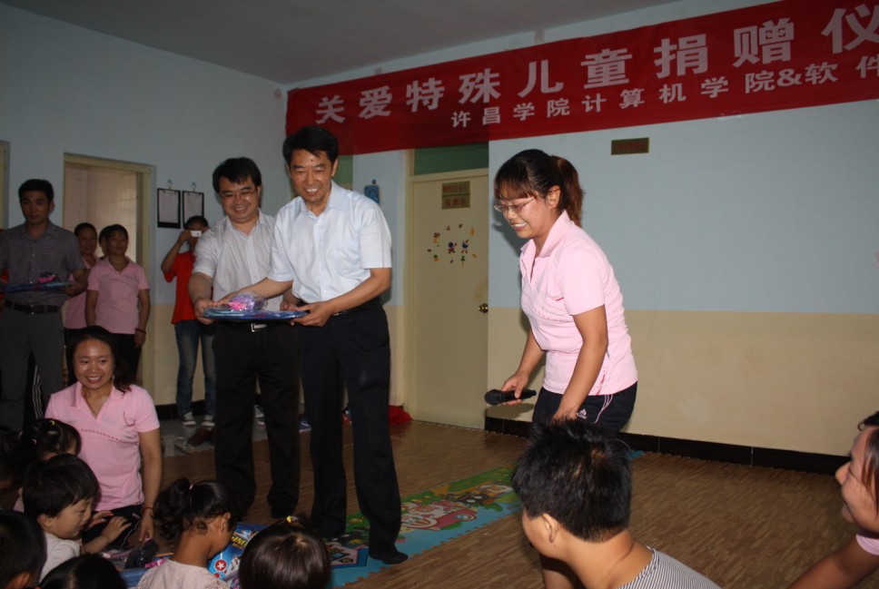 下午三点,王洪彬副书记带领慰问团首先来到许昌市博爱儿童康健园——一家专门接收心智障碍儿童(脑瘫、智障、自闭症等)进行特殊教育的社会公益机构。计算机科学与技术学院(软件职业技术学院)11名老员工正在这里进行“学雷锋、见行动、关爱特殊儿童”的实践活动。”王洪彬副书记与队员们进行了亲切交谈,详细询问了志愿活动进行的情况,并语重心长地告诉大家:“儿童是祖国的未来,这其中当然包括特殊儿童,你们帮助这些孩子进行康复训练和早期文化教育,是用实际行动表达对他们的爱护。希望通过更多类似的活动,能够唤起社会对特殊儿童更多的关注”。之后,王洪彬副书记参加了计科院(软件学院)为博爱儿童康健园举办的爱心捐赠仪式,并给他们送上文具、书包等学习用品,表达了公司对特殊儿童的关爱。